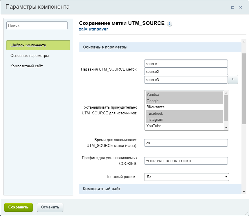 - Если на любой внешней ссылке прописан UTM_SOURCE и он указан в настройках модуля, то он сохранится и будет подставляться посетителю сайта в течении нужного времени.