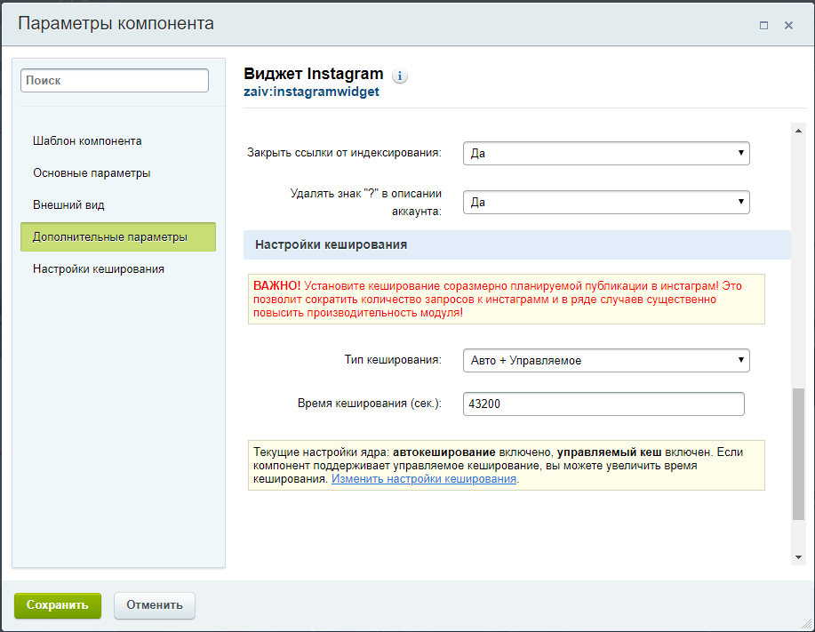 Из списка компонентов визуального редактора установить компонент "Виджет Instagram" и настроить его параметры. В целях оптимизации быстродействия не рекомендуется устанавливать период обновления кеша чаще, чем публикуются новые записи в аккаунте Instagram.